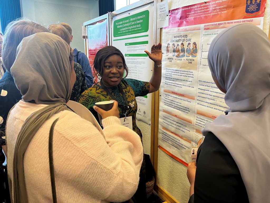 PhD student Adiza Mumuni, University of Ghana, presenting her poster on Feasibility and accepatability of midwife-led continuity of care among midwives in Southern Ghana.