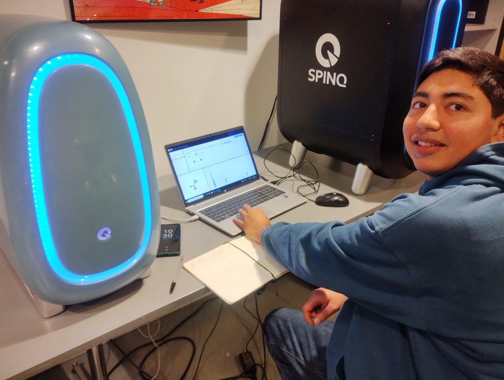 Andrés is running a two-qubit circuit carefully devised to learn the “unknown” phase of a slightly generalized Bell-state. His coworker Lenni Tom Walter was not present when the picture was taken.